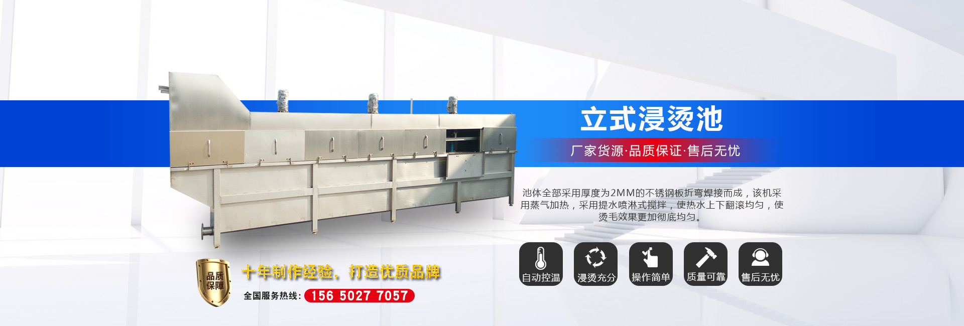 公司長(zhǎng)期與國(guó)內(nèi)外屠宰加工企業(yè)合作,走引進(jìn)——消化——?jiǎng)?chuàng)新和自主研發(fā)相結(jié)合的道路,在國(guó)內(nèi)外同類產(chǎn)品的基礎(chǔ)上,不斷更新和改造。公司主要設(shè)備有:A字型立式脫毛機(jī)、臥式脫毛機(jī)、強(qiáng)力噴淋機(jī)、松毛機(jī)、浸燙池、螺旋預(yù)冷機(jī)、禽籠清洗機(jī)、電暈機(jī)、兔扯皮機(jī)、兔割前爪/后爪機(jī)、剝胗機(jī)、自動(dòng)洗鉤機(jī)、螺旋燙爪機(jī)、雞爪脫皮機(jī)、分割輸送帶等屠宰用設(shè)備。其中,公司獨(dú)力發(fā)明生產(chǎn)設(shè)計(jì)的“電動(dòng)調(diào)節(jié)脫毛機(jī)”及“自動(dòng)控水控溫浸燙池”順利通過(guò)知識(shí)產(chǎn)權(quán)局的實(shí)質(zhì)性審查。公司所生產(chǎn)的設(shè)備 可與國(guó)外同類產(chǎn)品配套使用,設(shè)備遠(yuǎn)銷阿爾及利亞、澳大利亞等中東、非州等并建立了長(zhǎng)期穩(wěn)定的合作關(guān)系。